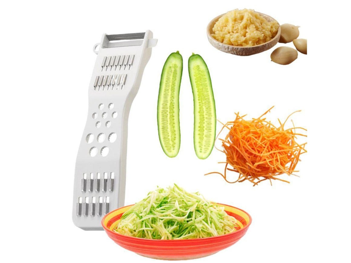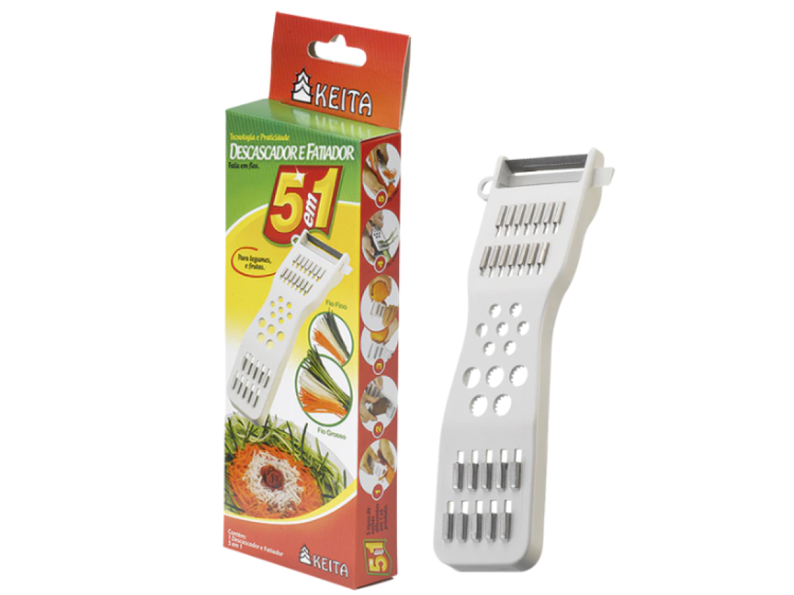 Com uma lâminas que realizam 05 funções: descascador, ralador, descascador para alimentos com circunferência, cortar fios grossos e fios finos.