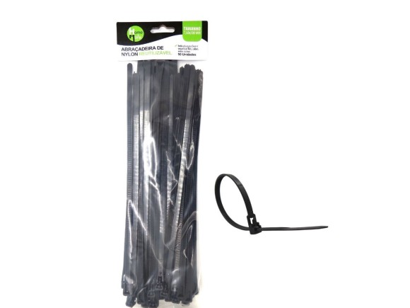 A abraçadeira reutilizável é fabricada em nylon resistente com acabamento na cor preta. Indicado para o uso doméstico e industrial, para a fixação diversa em cabos elétricos, veículos, bicicletas, etc.DescriçãoComprimento: 300mmEspessura: 7,60mmComposição: NylonCor: PretaContém 50 unidades