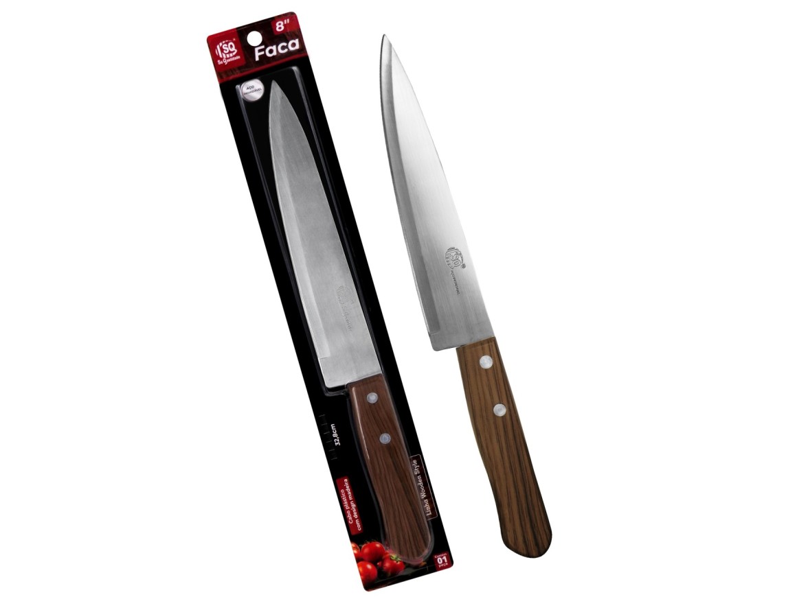 Apresentando a FACA INOX 8" - o complemento perfeito para o seu arsenal de cozinha! precisão e precisão sempre que for utilizada. O cabo é feito de plástico que imita a aparência da madeira verdadeira, proporcionando um manuseio confortável e seguro. Com comprimento de lâmina de 20 cm, esta faca é ideal para diversas tarefas na cozinha , desde cortar legumes até cortar carnes. Confie na qualidade e confiabilidade da marca sq - atualize sua cozinha com o FACA INOX 8" hoje!